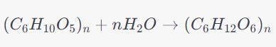 \[ (C_6H_{10}O_5)_n + nH_2O \rightarrow (C_6H_{12}O_6)_n \]