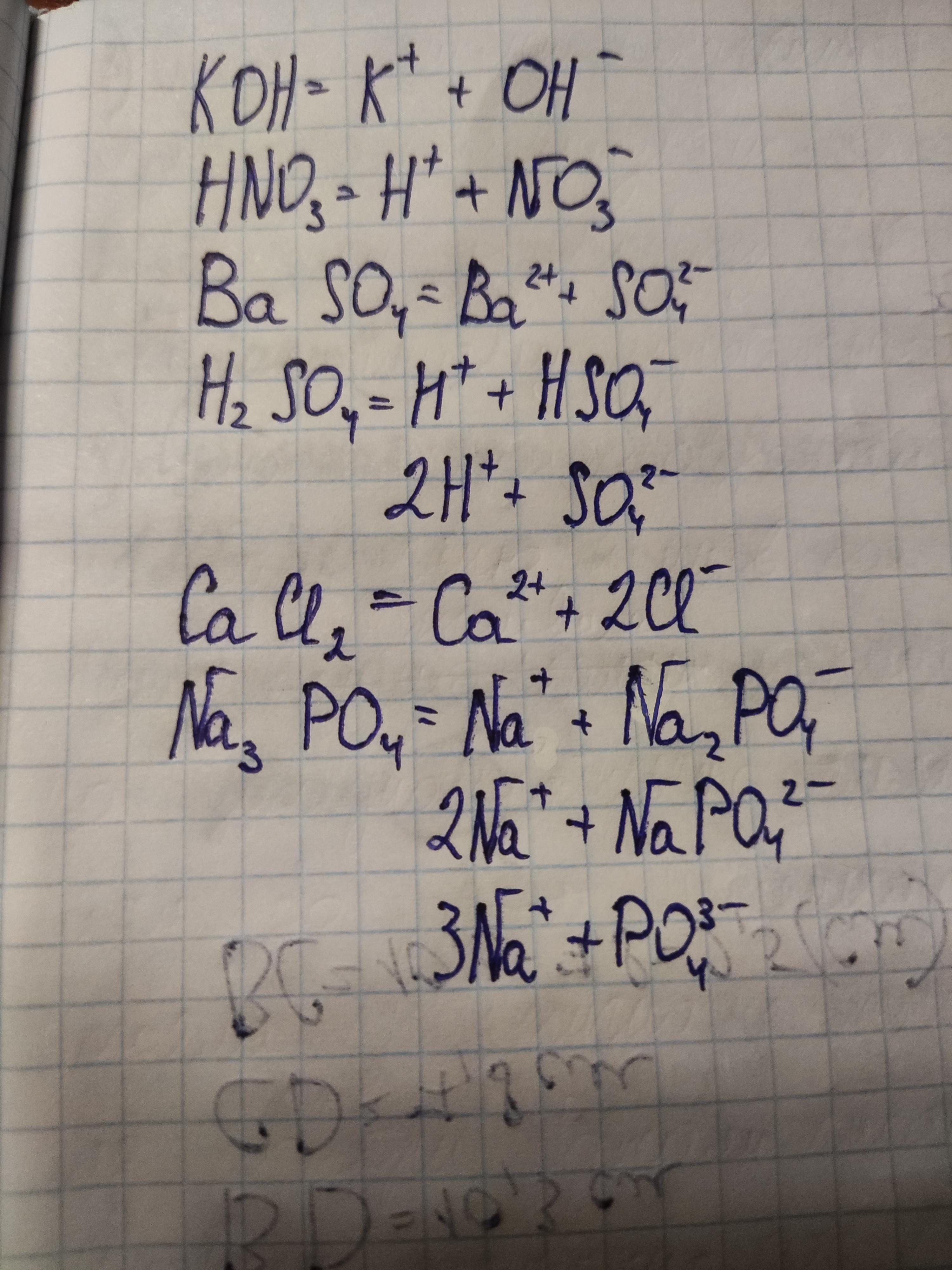 напишіть рівняння електролітичної дисоціації у водному розчині сполук із такими формулами: KOH, HNO₂, BaSO₄, H₂SO₄, CaCl₂, Na₃PO₄.