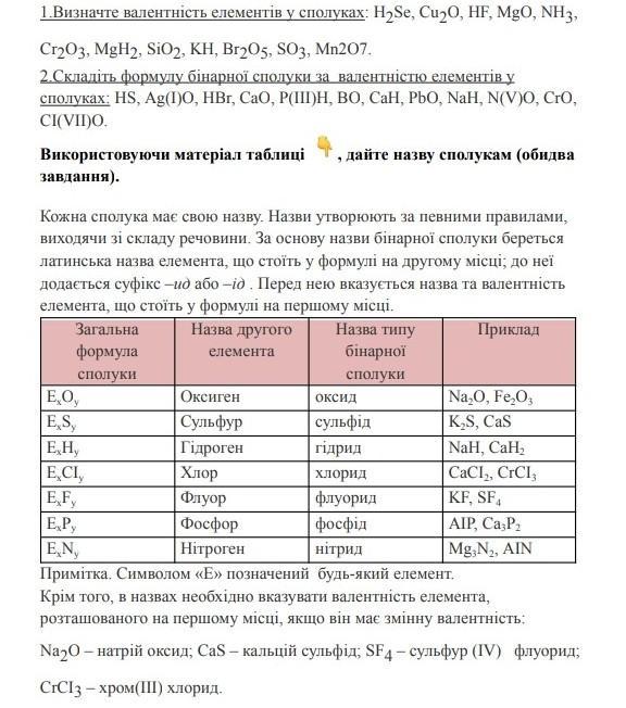 1.Визначте валентність елементів у сполуках: Н2Se, Cu2O, HF, MgO, NH3, Cr2O3, MgH2, SiO2, KH, Br2O5, SO3, Mn2O7. 2.Складіть формулу бiнарної сполуки за валентністю елементів у сполуках: HS, Ag(1)O, HBr, CaO, P(III)H, BO, CaH, PbO, NaH, N(V)O, CrO, CI(VII)O. Використовуючи матерiал таблиці завдання). дайте назву сполукам
