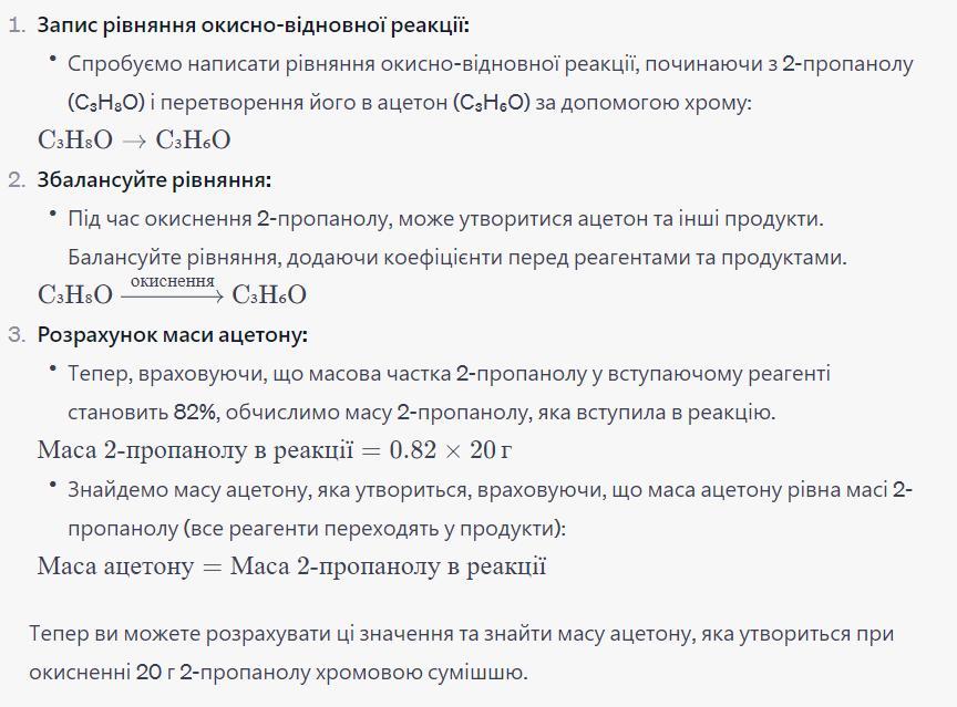 Скільки грамів ацетону можна одержати з 20 г 2-пропанолу при окисненні його хромовою сумішшю, якщо масова частка спирту, що вступив в реакцію, становить 82%? Записати рівняння окисно- відновного процесу.