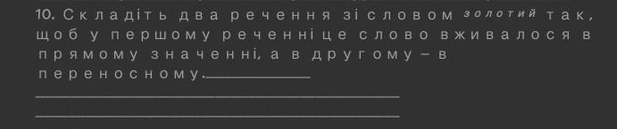 10. Складіть два речення зі словом золотий так, щоб у першому реченні це слово вживалося в прямому значенні, а в другому - в п е р е н о сному. помогите пожалуйста