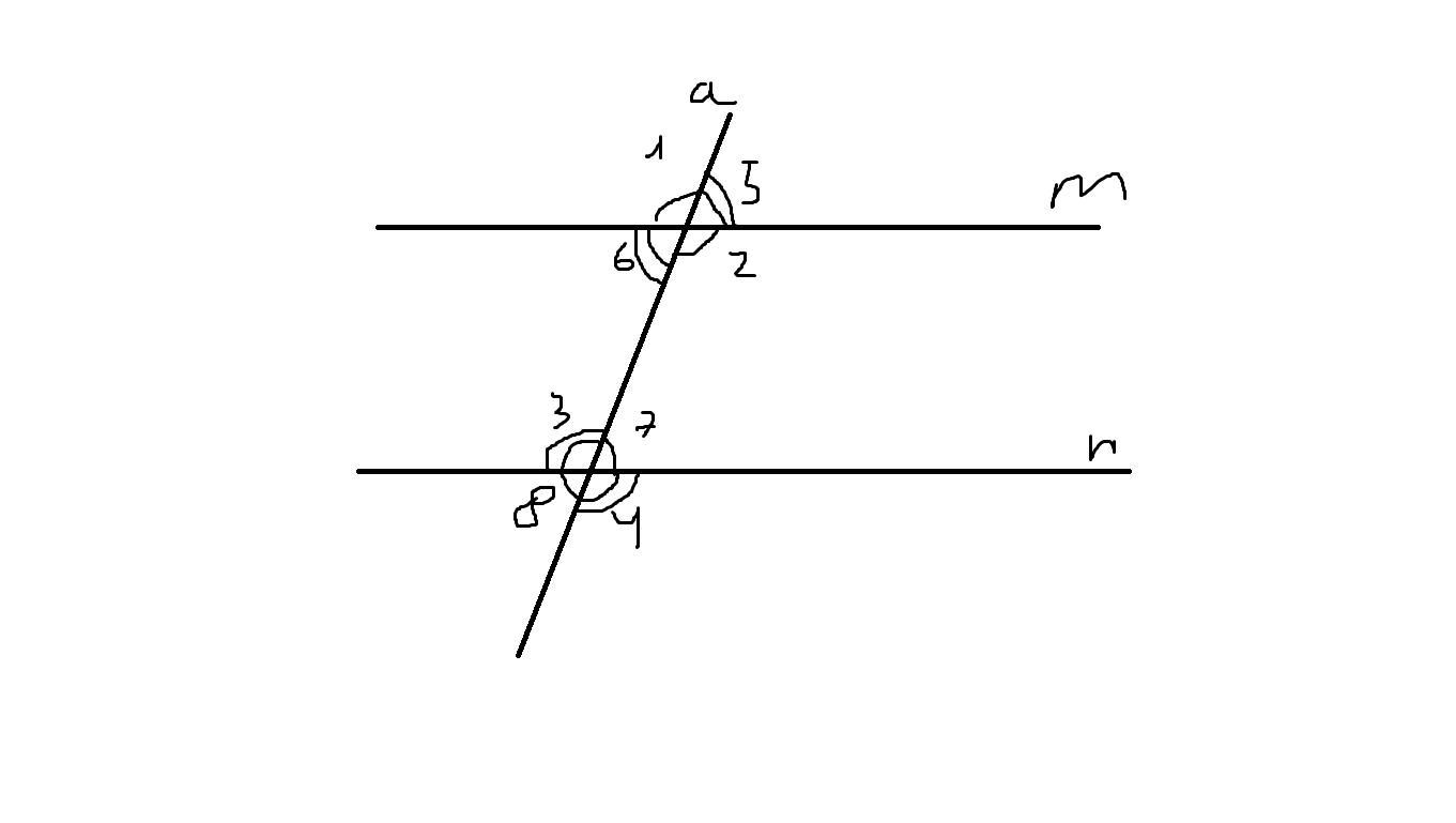 4) якщо прямі m i n паралельні то чотири кути такі як 1 2 3 4 мають бути рівними (за умовою вони рівні) та інші чотири кут такі як 5 6 7 8 мають бути рівним (вони теж рівні за умовою)