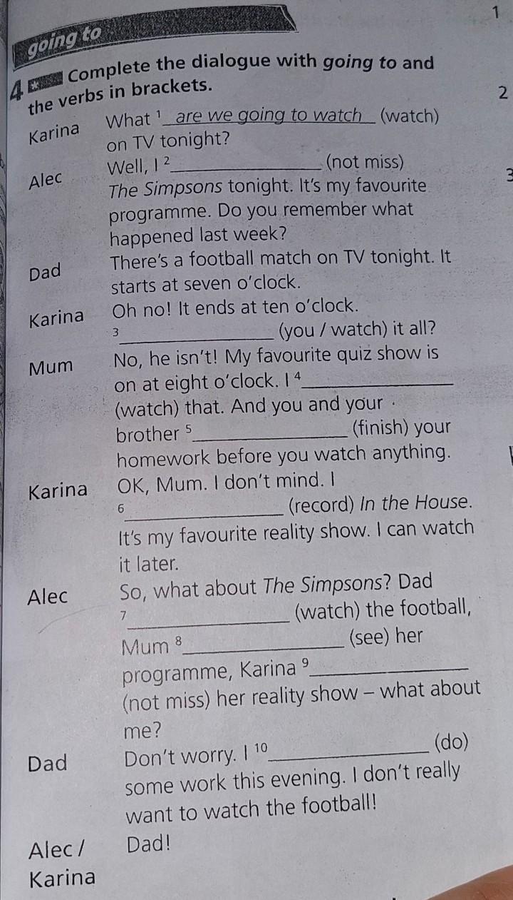 going to Complete the dialogue with going to and the verbs in brackets. Karina What are we going to watch___ (watch) on TV tonight? Alec Dad Karina Mum Alec Dad Well, 12 (not miss) The Simpsons tonight. It's my favourite programme. Do you remember what happened last week? There's a football match on TV tonight. It starts at seven o'clock. Oh no! It ends at ten o'clock. 3 Alec / Karina (you/watch) it all? No, he isn't! My favourite quiz show is Karina OK, Mum. I don't mind. I 6 on at eight o'clock. 14_________ (watch) that. And you and your. brother 5 (finish) your homework before you watch anything. (record) In the House. It's my favourite reality show. I can watch it later. So, what about The Simpsons? Dad 7 (watch) the football, (see) her Mum 8 9 programme, Karina º (not miss) her reality show - what about me? Don't worry. I 10 (do) some work this evening. I don't really want to watch the football! Dad!