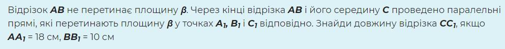 Відрізок АВ не перетинає площину β. Через кінці відрізка АВ і його середину С проведено паралельні прямі, які перетинають площину β у точках А1, В1 і С1 відповідно. Знайди довжину відрізка СС1, якщо АА1 = 18 см, ВВ1 = 10 см