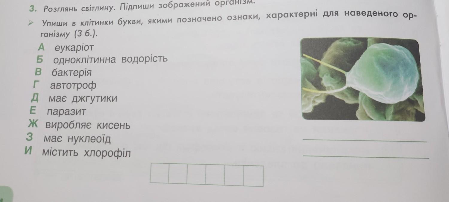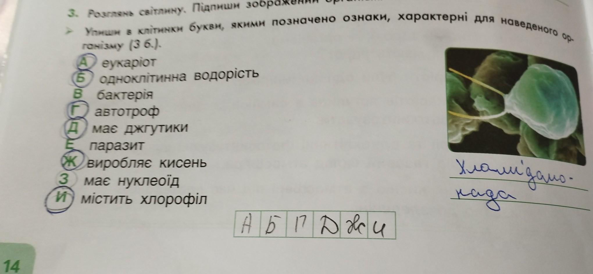 14 Упиши в клітинки букви, якими позначено ознаки, характерні для наведеного ор- ганізму (3 б.). A еукаріот Б одноклітинна водорість в бактерія Г автотроф Д має джгутики E паразит ж виробляє кисень має нуклеоїд 3 И містить хлорофіл