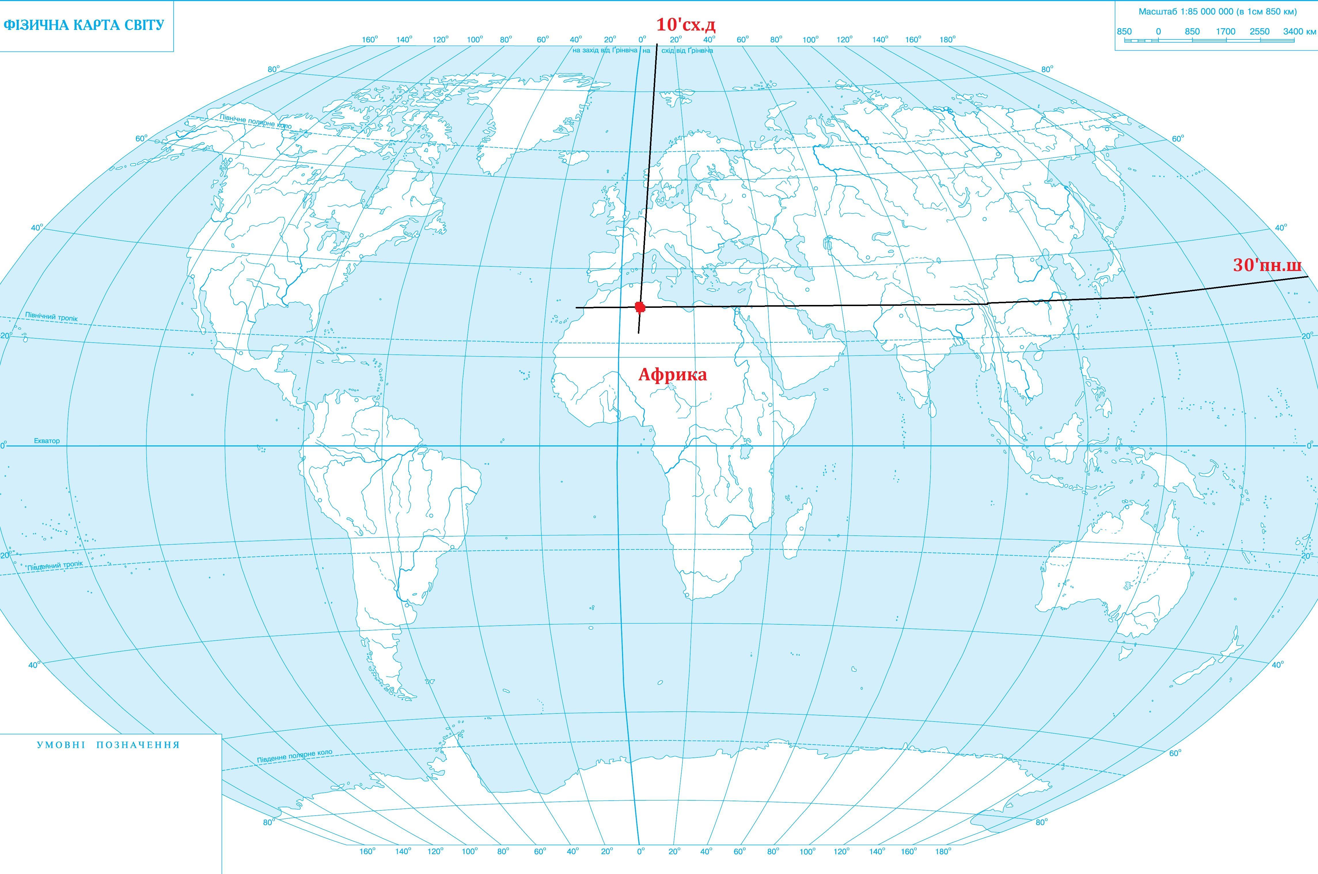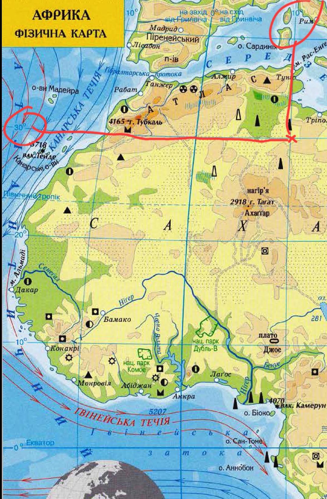 Точка з координатами 30°пн.ш. 10°сх.д. розташована на материку Африка.