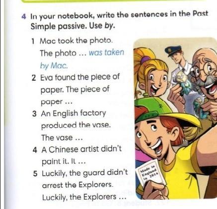 LOOK! Pops broke the vase. The vase was broken by Pops. Who was the vase broken by? 4 In your notebook, write the sentences in the Past Simple passive. Use by. 1 Mac took the photo. The photo... was taken by Mac. 2 Eva found the piece of paper. The piece of paper... 3 An English factory produced the vase. The vase... 4 A Chinese artist didn't paint it. It ... 5 Luckily, the guard didn't arrest the Explorers. Luckily, the Explorers ... Made in England in 2014