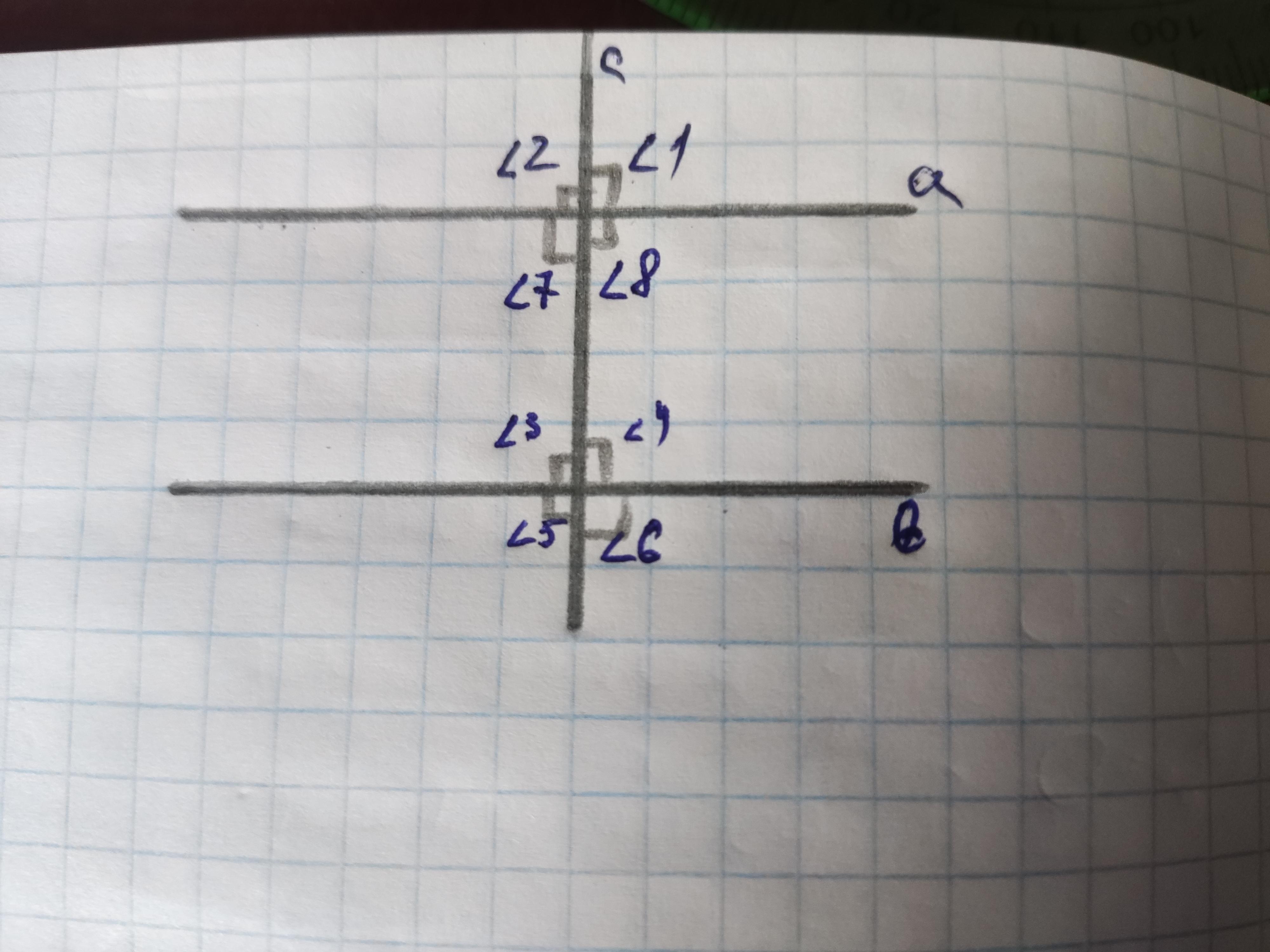 Прямі а і б паралельні, бо пряма а і б перпендикулярні до однієї прямої с, тобто січної. Усі кути будуть рівними та будуть дорівнювати 90°.