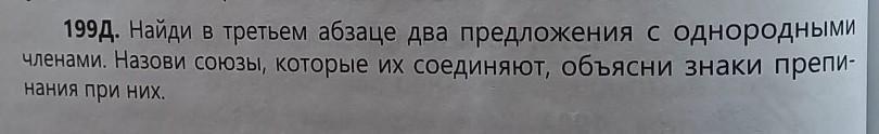 199д. Найди в третьем абзаце два предложения с однородными членами. Назови союзы, которые их соединяют, объясни знаки препи- нания при них.