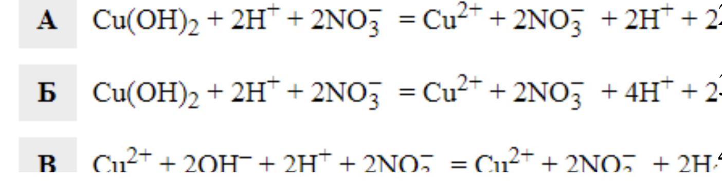 Оберіть рядок, в якому правильно записано повне іонно-молекулярне рівняння реакції між купрум (II)гідроксидом і нітратною кислотою: