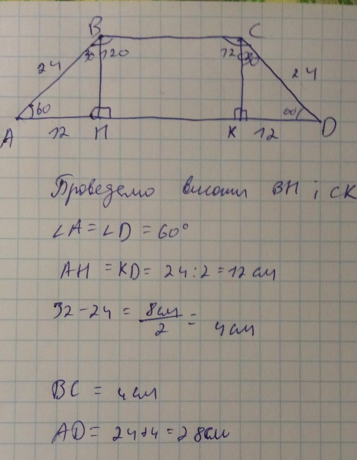 76. У рівнобічній трапеції тупий кут дорівнює 120°, а бічна сторона — 24 см. Знайдіть основи трапеції, якщо їхня сума дорівнює 32 см.