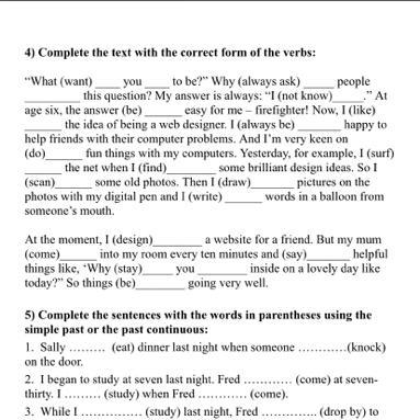 “What (do) you want to be?” Why (do) people always ask this question? My answer is always: “I (don’t) know.” At age six, the answer (was) easy for me-firefighter! Now, I (like) the idea of being a web designer. I (have always been) happy to help friends with their computer problems. And I’m very keen on (doing) fun things with my computers. Yesterday, for example, I (was surfing) the net when I (found) some brilliant design ideas. So I (scanned) some old photos. Then I (drew) pictures on the photos with my digital pen and I (wrote) words in a balloon from someone’s mouth. At the moment, I (am designing) a website for a friend. But my mum (comes) into my room every ten minutes and (says) helpful things like, 'Why (are) you staying inside on a lovely day like today?" So things (are not) going very well.