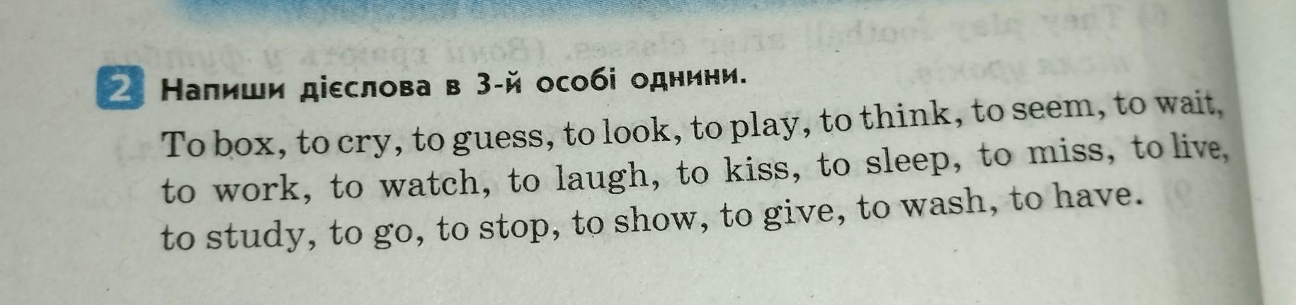 29228 2 Напиши дієслова в 3-й особі однини. To box, to cry, to guess, to look, to play, to think, to seem, to wait, to work, to watch, to laugh, to kiss, to sleep, to miss, to live, to study, to go, to stop, to show, to give, to wash, to have. 102