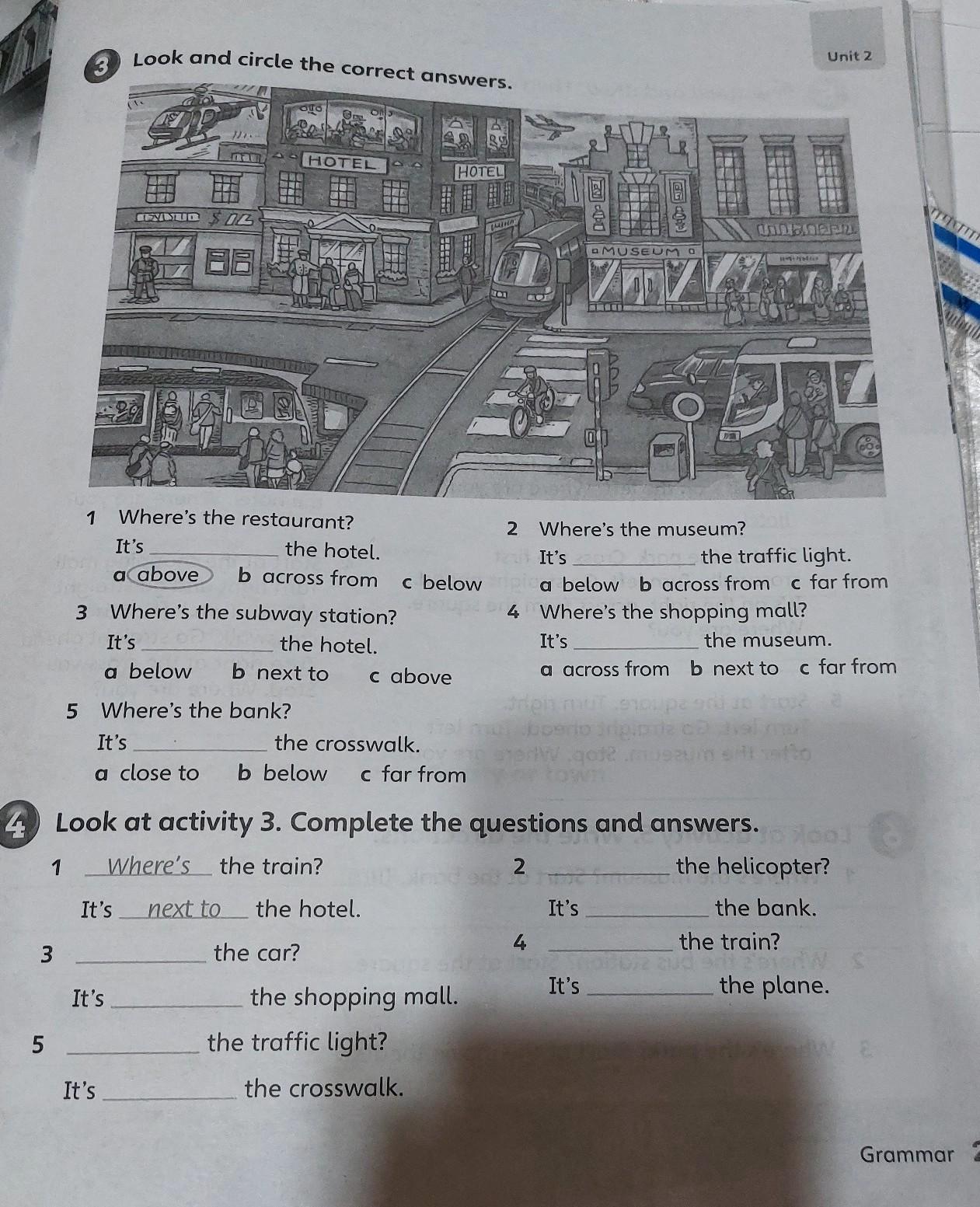 5 3 (3 It's It's Look and circle the correct answers. SEVINUD DG A 4+H 5 Where's the bank? HOTEL 1 Where's the restaurant? It's the hotel. a above b across from c below 3 Where's the subway station? the hotel. It's a below b next to c above It's the crosswalk. a close to b below c far from HOTEL the shopping mall. the traffic light? the crosswalk. JAZOER 4 Look at activity 3. Complete the questions and answers. 1 Where's the train? 2 the helicopter? It's next to the hotel. the bank. the car? MUSEUM DIZZYTY 2 Where's the museum? 4 Schi GG dipte 4 It's the traffic light. a below b across from c far from Where's the shopping mall? It's the museum. a across from b next to c far from It's COLOPEN It's the train? the plane. Grammar