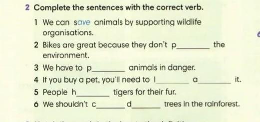 2 Complete the sentences with the correct verb. 1 We can save animals by supporting wildlife organisations. 2 Bikes are great because they don't p________ the environment. 3 We have to p 4 If you buy a pet, you'll need to I 5 People h 6 We shouldn't c animals in danger. tigers for their fur. d it. trees in the rainforest.