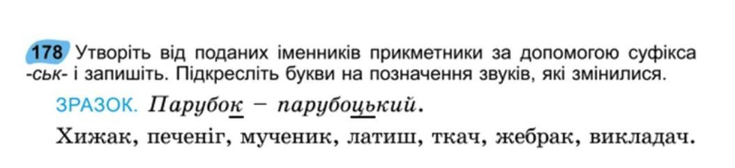 60 БАЛОВ СРОЧНО ПЖ. Утворіть від поданих іменників прикметники за допомогою суфікса -ськ- і запишіть. Підкресліть букви на позначення звуків, які змінилися. ЗРАЗОК. Парубок парубоцький. Хижак, печеніг, мученик, латиш, ткач, жебрак, викладач.