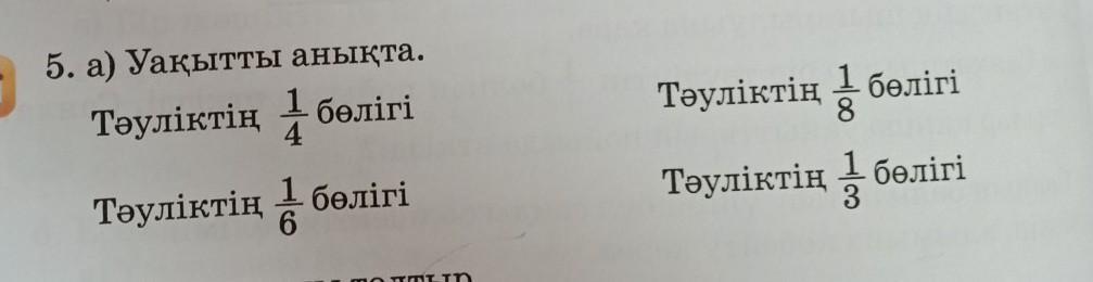 5. а) Уақытты анықта. 1 бөлігі Тәуліктің Тәуліктің – бөлігі Тәуліктің 3 бөлігі Тәуліктің 2 бөлігі 3
