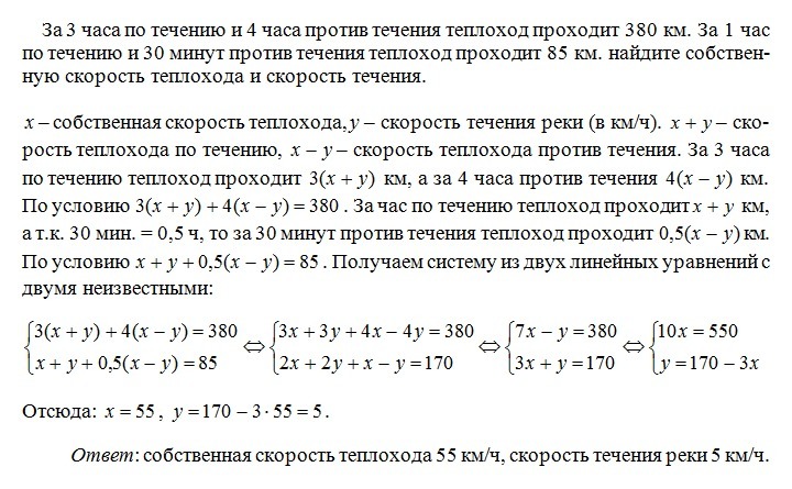 за 3 часа по течению и 4 часа против течения теплоход проходит 380 км. за 1 час по течению и 30 минут против течения теплоход проходит 85 км. найдите собственную скорость теплохода и скорость течения