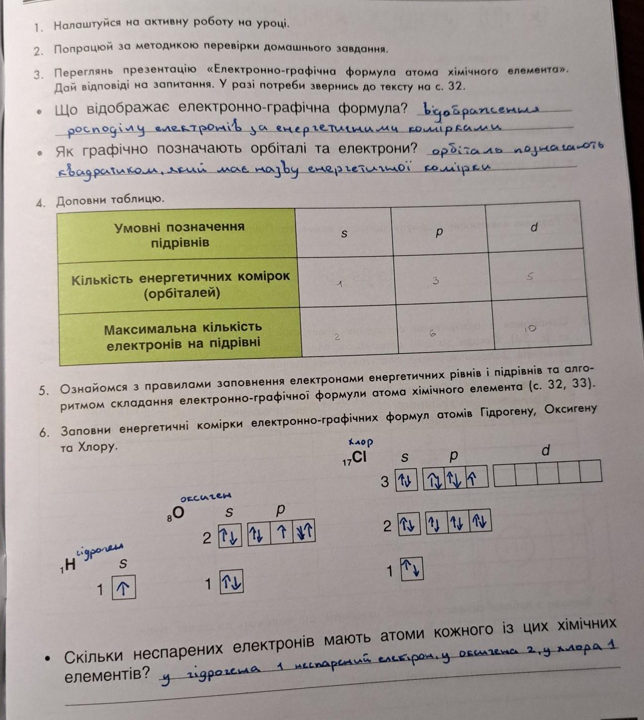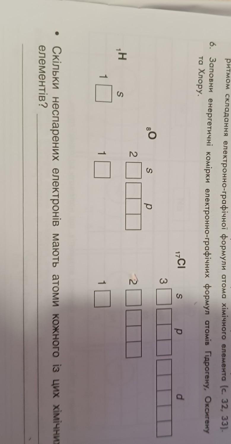6. Заповни енергетичні комірки електронно-графічних формул атомів Гідрогену, Оксигену та Хлору. H 1 S 80 2 S p 17CI 3 2 S р d Скільки неспарених електронів мають атоми кожного із цих хімічних елементів?