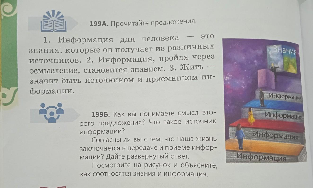 199Б. Как вы понимаете смысл вто- рого предложения? Что такое источник информации? Согласны ли вы с тем, что наша жизнь заключается в передаче и приеме инфор- мации? Дайте развернутый ответ. Посмотрите на рисунок и объясните, как соотносятся знания и информация.