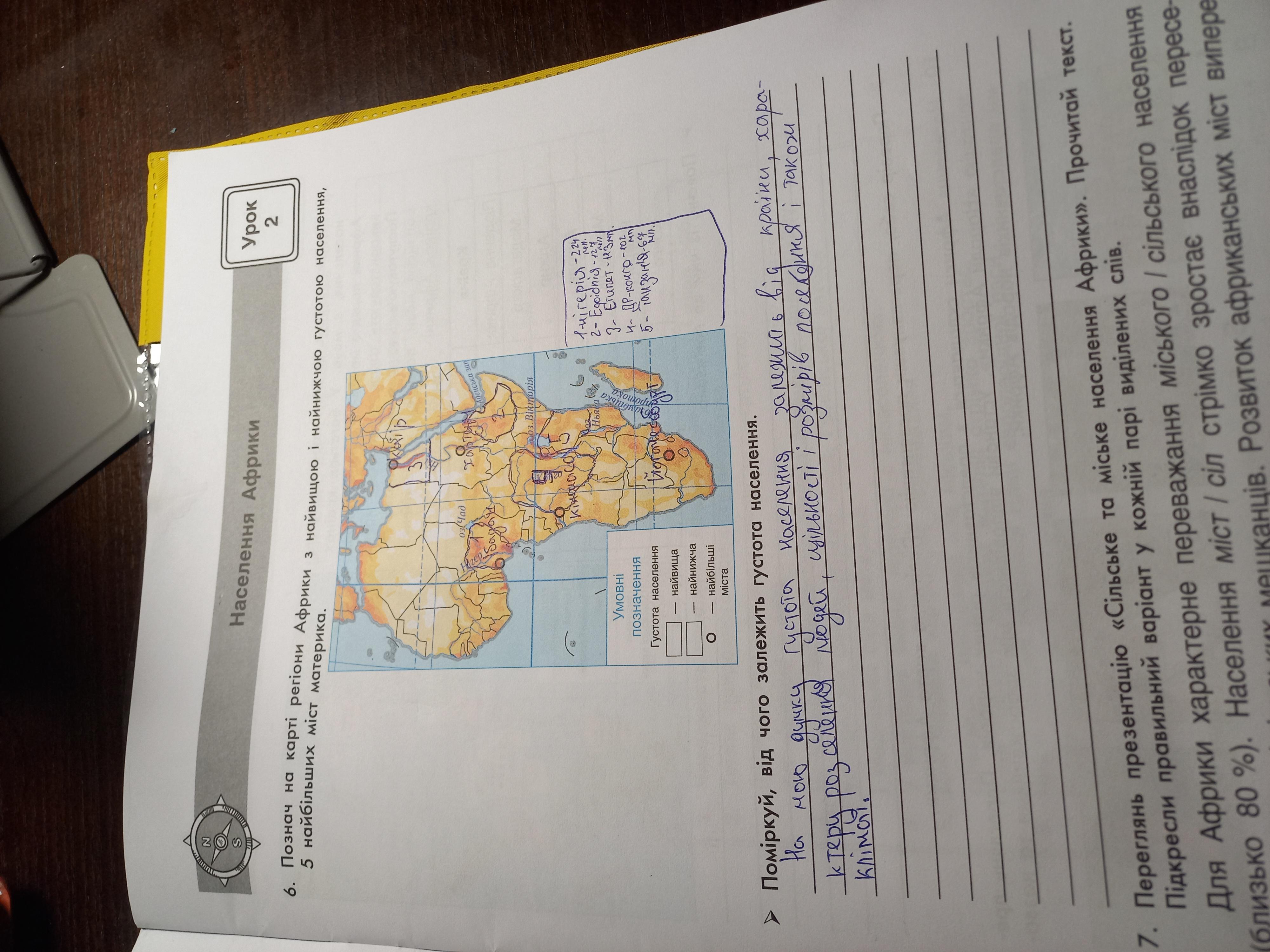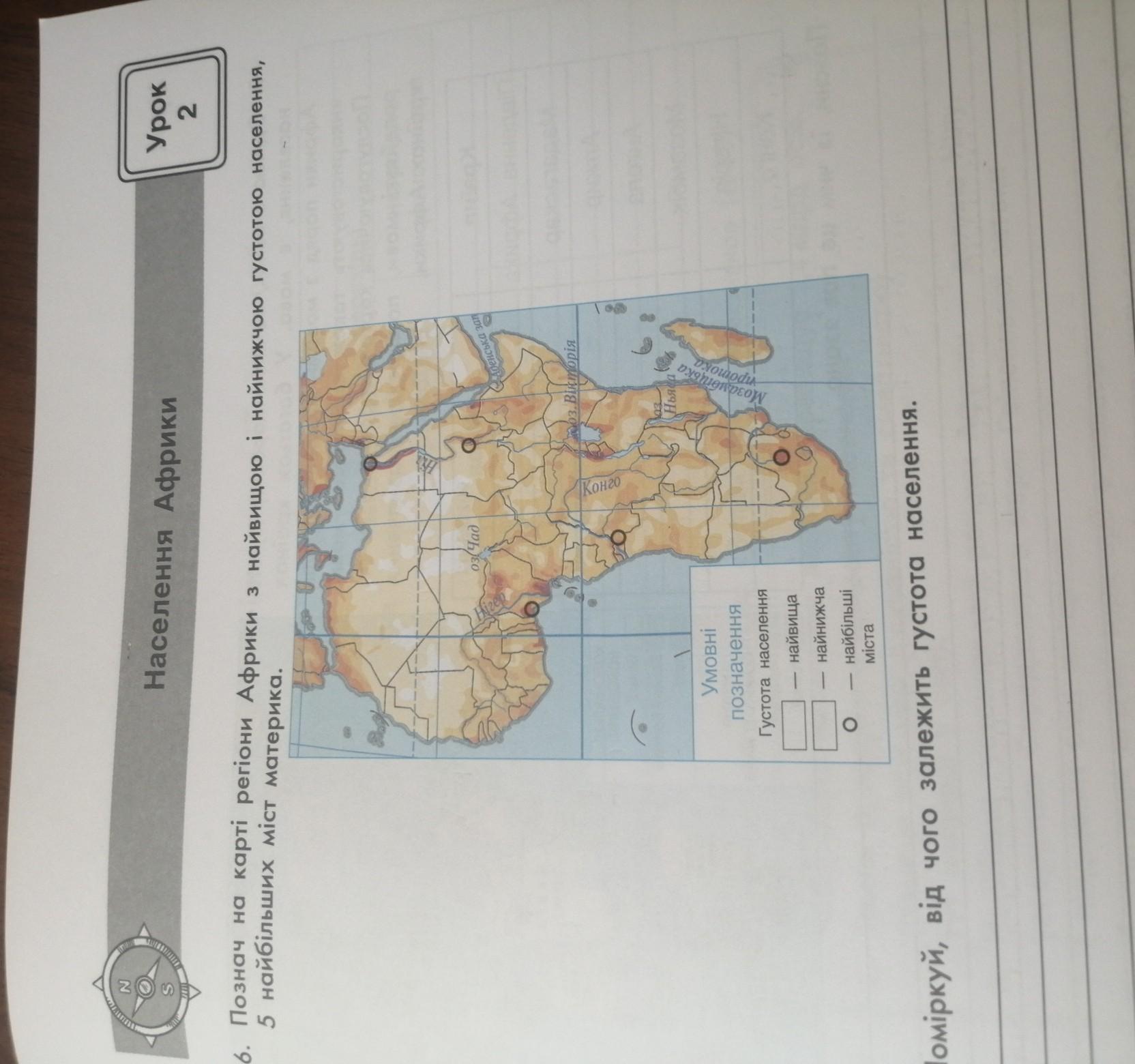 6. Познач на карті регіони Африки з найвищою і найнижчою густотою населення, 5 найбільших міст материка. Умовні позначення Густота населення