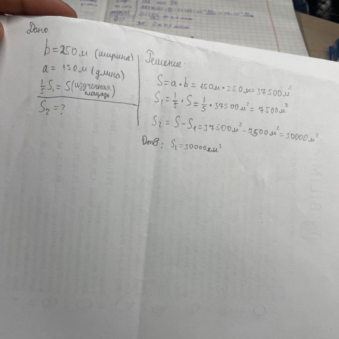 Ширина площадки для проведения раскопок-250м а длина-150м больше одна пятая часть площадки уже изучена а остальная часть - ещё нет на сколько квадратных метров изучено меньше чем ещё предстоит