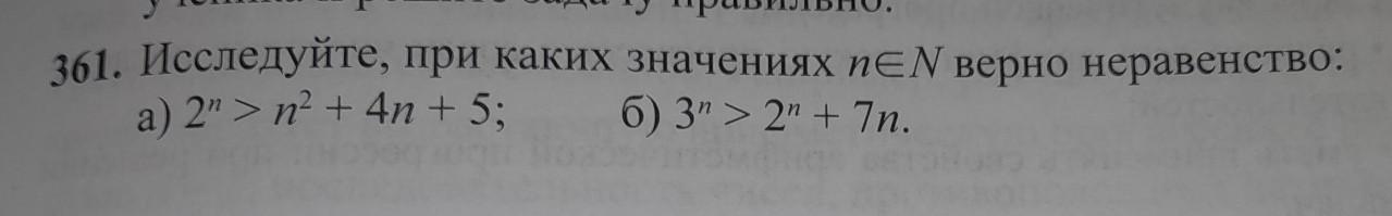 361. Исследуйте, при каких значениях nEN верно неравенство: a) 2" > n² + 4n + 5; б) 3"> 2" + 7n.