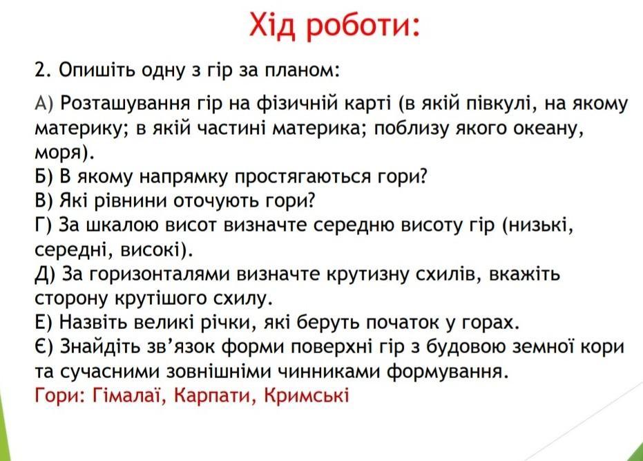 Хід роботи: 2. Опишіть одну з гір за планом: А) Розташування гір на фізичній карті (в якій півкулі, на якому материку; в якій частині материка; поблизу якого океану, моря). Б) В якому напрямку простягаються гори? В) Які рівнини оточують гори? Г) За шкалою висот визначте середню висоту гір (низькі, середні, високі). Д) За горизонталями визначте крутизну схилів, вкажіть сторону крутішого схилу. Е) Назвіть великі річки, які беруть початок у горах. Є) Знайдіть зв'язок форми поверхні гір з будовою земної кори та сучасними зовнішніми чинниками формування. Гори: Гімалаї, Карпати, Кримські