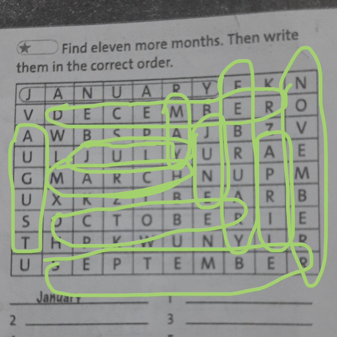 January, 1) December(2ряд) 2) March ((5ряд), 3) July (4ряд), 4)February ( 8ряд по горизонтали и вниз) , 5) October ( 7ряд) , 6)September (последний ряд) 7) August ( 1ряд по горизонтали и вниз) 8) may(6ряд по горизонтали) , 9) June ( 7ряд) , 10) November (последний ряд по горизонтали и вниз) , 11) April ( предпоследний ряд по горизонтали и вниз)