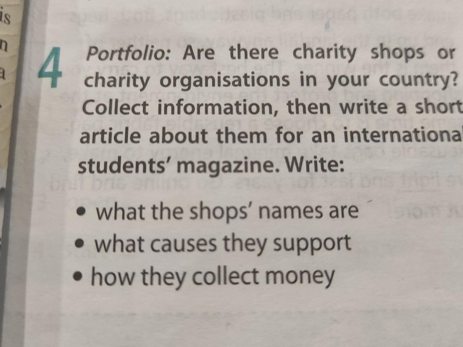 Портфолио: Есть ли в вашей стране благотворительные магазины или благотворительные организации? Соберите информацию, а затем напишите о них короткую статью для международного студенческого журнала. Писать: ⚫ как называются магазины ⚫ какие дела они поддерживают • как они собирают деньги