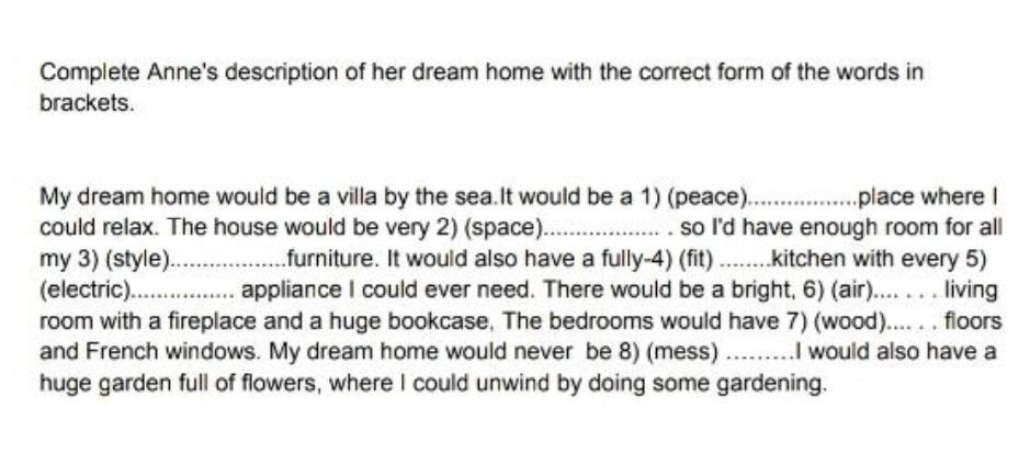 Объяснение:My dream home would be a villa by the sea. It would be a 1) peaceful place where I could relax. The house would be very 2) spacious so I'd have enough room for all my 3) stylish furniture. It would also have a fully-4) fitted kitchen with every 5) electrical appliance I could ever need. There would be a bright, 6) airy living room with a fireplace and a huge bookcase. The bedrooms would have 7) wooden floors and French windows. My dream home would never be 8) messy. I would also have a huge garden full of flowers, where I could unwind by doing some gardening