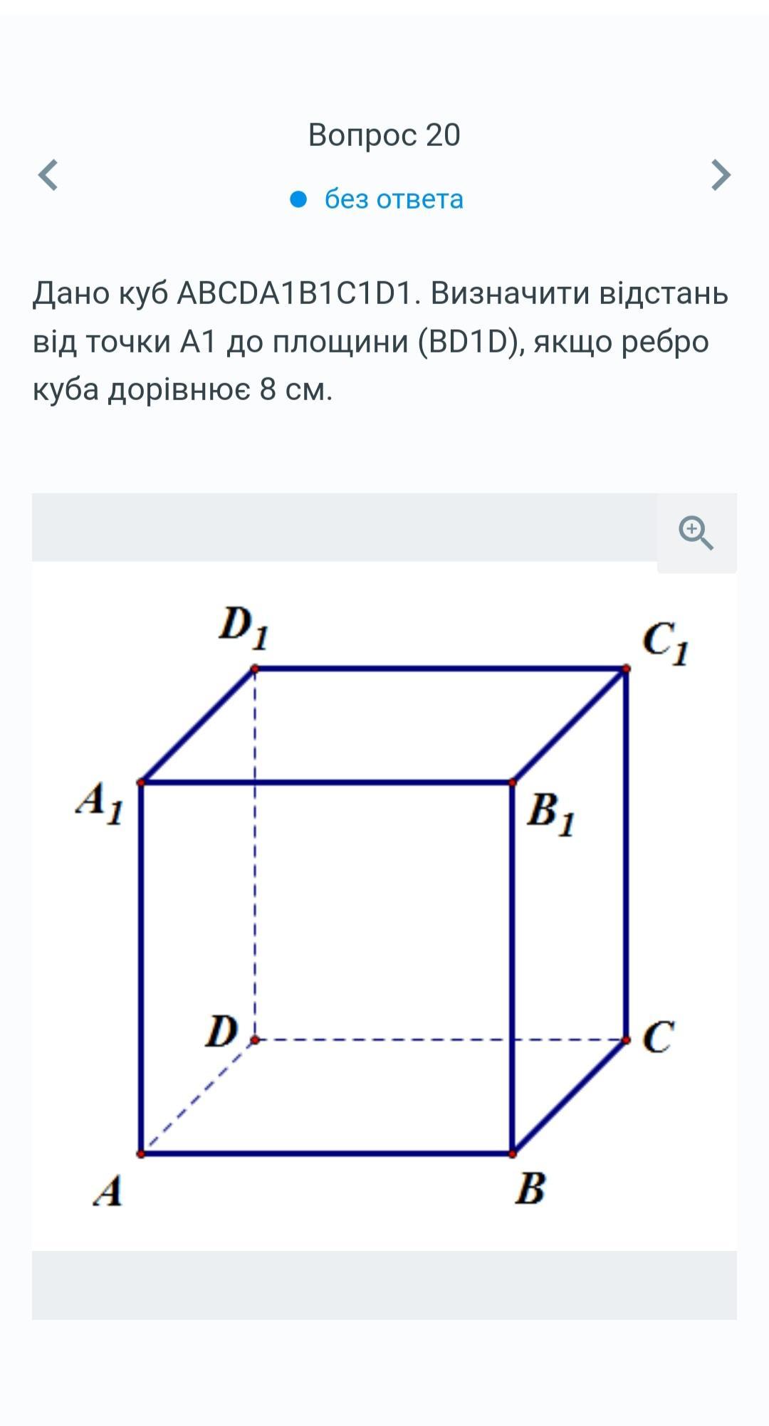 Тож відстань від точки А1 до площини (ВD1D) це відрізок А1О.