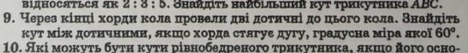 9. Через кінці хорди кола провели дві дотичні до цього кола. Знайдіть кут між дотичними, якщо хорда стягуе дуту, градусна міра якої 60°.
