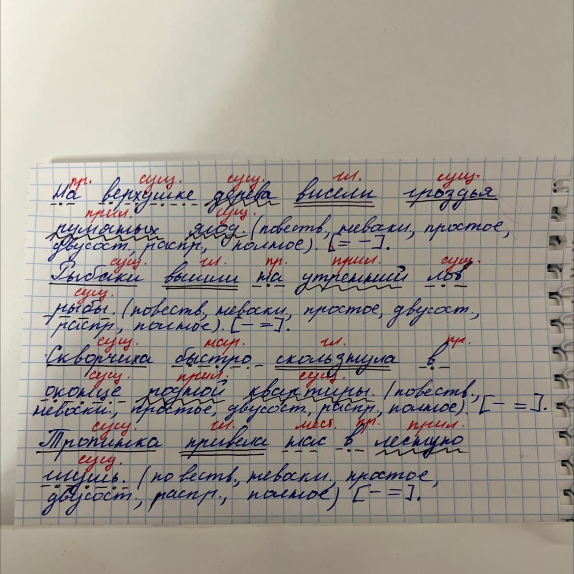 Синтаксический разбор: (На верхушке дерева висели гроздья румяных ягод)