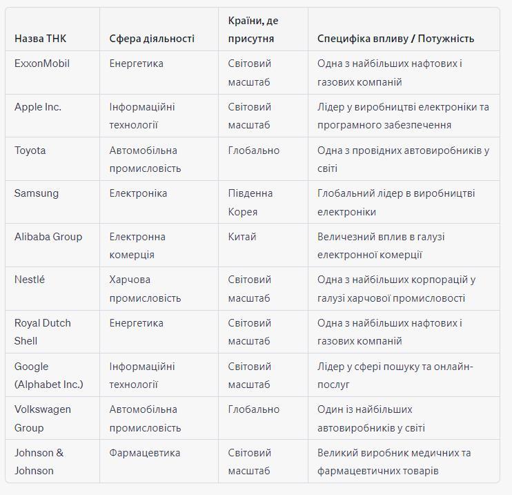 Будь ласка!!!!! ТЕРМІНОВО!!!! На основі матеріалу підручника та інтернету скласти таблицю найвпливовіших і найпотужніших ТНК "Великої двадцятки"(таблиця довільна)
