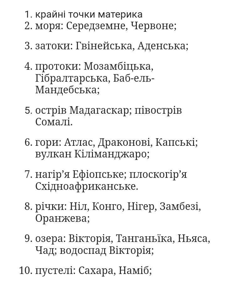 1. крайні точки материка 2. моря: Середземне, Червоне; 3. затоки: Гвінейська, Аденська; 4. протоки: Мозамбіцька, Гібралтарська, Баб-ель- Мандебська; 5. острів Мадагаскар; півострів Сомалі. 6. гори: Атлас, Драконові, Капські; вулкан Кiлiманджаро; 7. нагір'я Ефіопське; плоскогір'я Східноафриканське. 8. річки: Ніл, Конго, Нігер, Замбезі, Оранжева; 9. озера: Вікторія, Танганьїка, Ньяса, Чад; водоспад Вікторія; 10. пустелі: Сахара, Наміб; 7 класс помогите пожалуйста