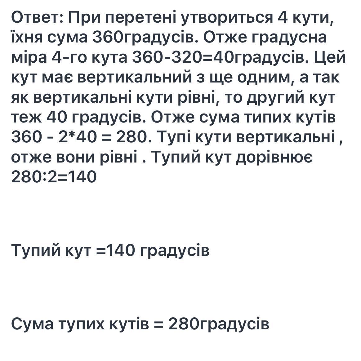 Ответ: При перетені утвориться 4 кути, їхня сума 360градусів. Отже градусна міра 4-го кута 360-320=40градусів. Цей кут має вертикальний з ще одним, а так як вертикальні кути рівні, то другий кут теж 40 градусів. Отже сума типих кутів 360 - 2*40 = 280. Тупі кути вертикальні , отже вони рівні . Тупий кут дорівнює 280:2=140