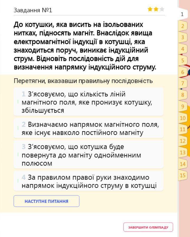 До котушки, яка висить на ізольованих нитках підносять магніт. Внаслідок явища електромагнітної індукції в котушці, яка знаходиться поруч, виникає індукційний струм. Відновіть послідовність дій для визначення напрямку індукційного струму. На фото: