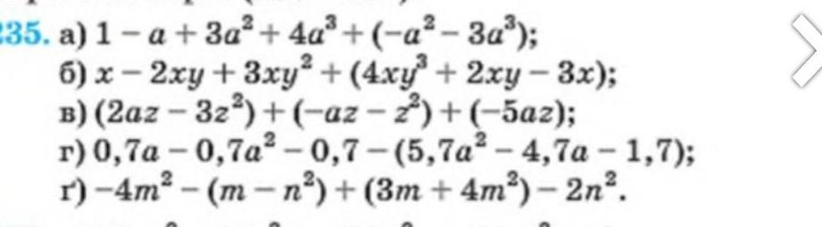 Спростіть вираз (235-237): 235. a) 1 - a +3a²+4a³+(-a² - 3a'); 6) x-2xy + 3xу² +(4xy³ + 2xy - 3x); в) (2az - 3z²) + (-az - 2²) + (-5аг); г) 0,7а-0,7a² - 0,7-(5,7a² - 4,7a-1,7); r) -4m² - (m - n²) + (3m + 4m²) - 2n².