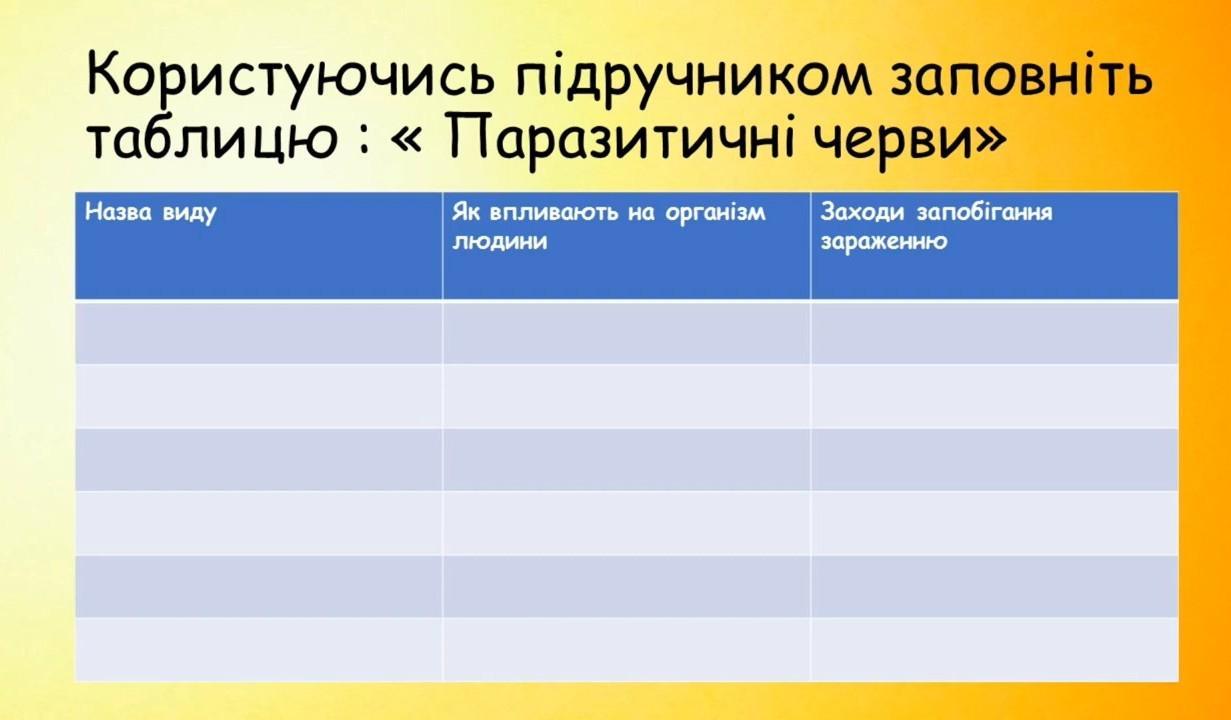 Таблицу "Паразитичні черви" можно заполнить, исходя из информации о различных видов паразитических червей и способов их воздействия на организм человека: