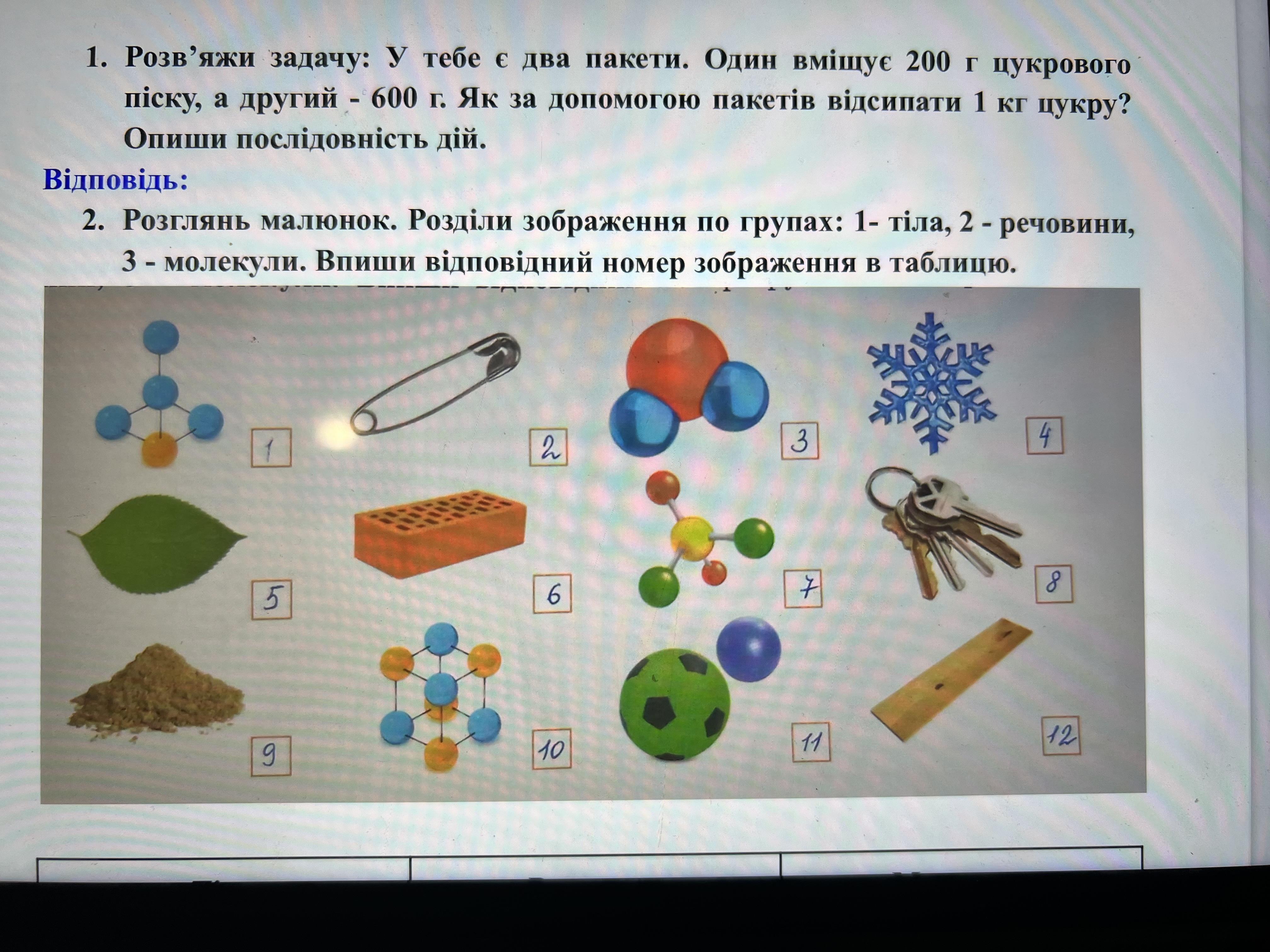 2. Розглянь малюнок. Розділи зображення по групах: 1- тіла, 2 - речовини,
