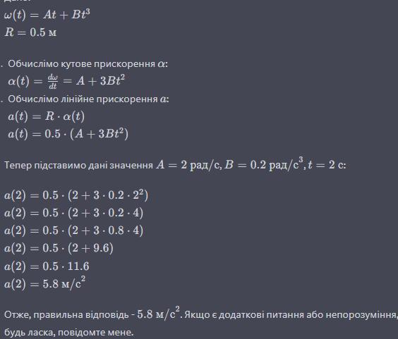 Определить полное ускорение а в момент t = 2 с точки, находящейся на ободе колеса радиусом R = 0,5 м, вращающегося согласно уравнению ω(t) = At + Bt³, где А = 2 рад/с; В = 0,2 рад/с³.
