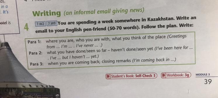 Ex 4 You are spending a week somewhere in Kazakhstan.Write an email to your English pen-friend (50-70 words). Follow the plan.Write: