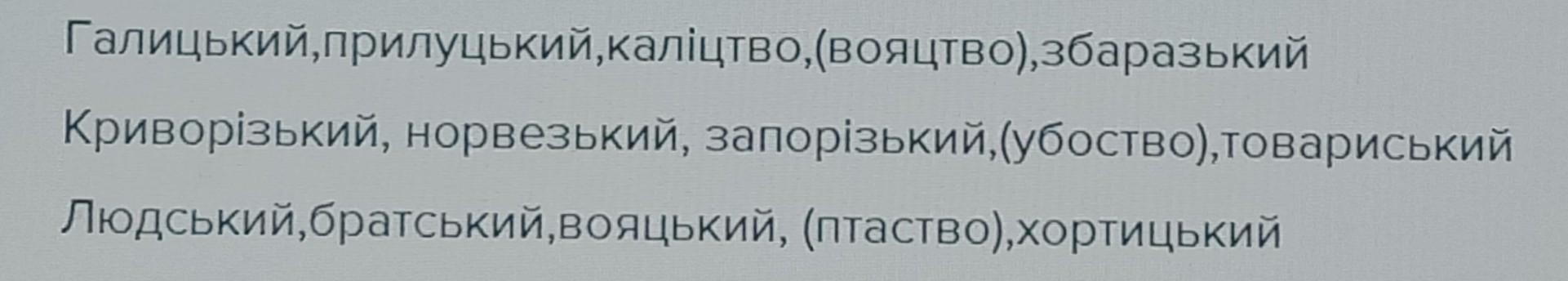 Гали…кий, прилу…кий, калі…тво, воя…тво, збара…кий.Криворі…кий, норве…кий, запорі…кий, убо…о, товари…кий. Люд…кий, брат…кий, воя…кий, пта…тво, хорти…кий