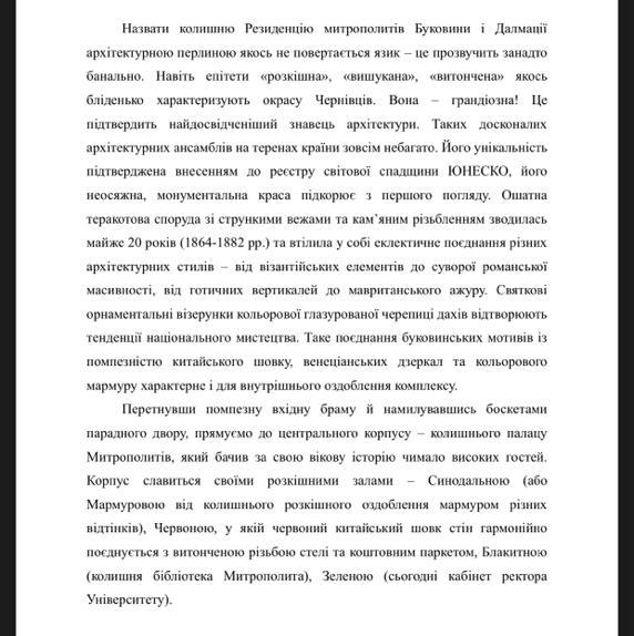 Текст описує колишню Резиденцію митрополитів Буковини і Далмації в Чернівцях як архітектурну перлину. Описуються грандіозність та унікальність будівлі, внесеної до реєстру світової спадщини ЮНЕСКО. Зазначається, що будівництво тривало майже 20 років і поєднало різні архітектурні стилі, від візантійських елементів до готичних вертикалей. В описі акцентується на красі та різноманітності деталей будівлі, включаючи теракотову споруду, кольорову глазуровану черепицю, внутрішнє оздоблення з буковинськими мотивами і елементами китайського шовку. Текст також розповідає про окремі розкішні зали в середині колишнього палацу митрополитів, які славляться своєю розкішшю та унікальністю.