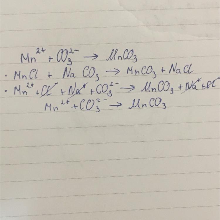За скорочений йонним рівнянням запишіть молекулярне та повне йонне рівняння: Mn2 + CO32- = MnCO3