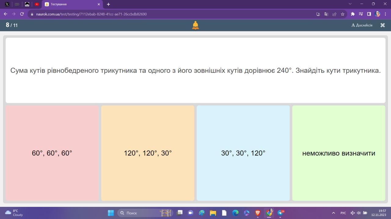 сума кутів рівнобедреного трикутника та одного з його зовнішніх кутів дорівнює 240 градусів . Знайдіть кути трикутника