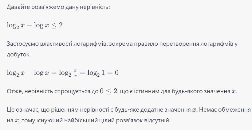 Розв’яжіть нерівність lg2x – lg x ≤ 2. У відповіді вкажіть найбільший цілий розв’язок.