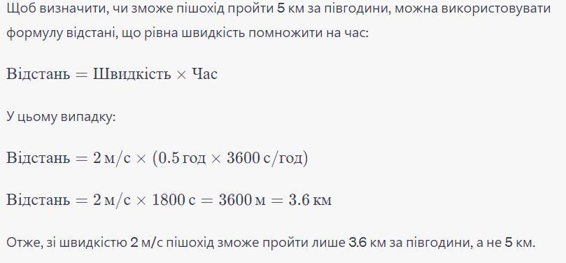 Чи зможе пішохід, рухаючись зі швидкість 2 м/с пройти за півгодини 5 км?