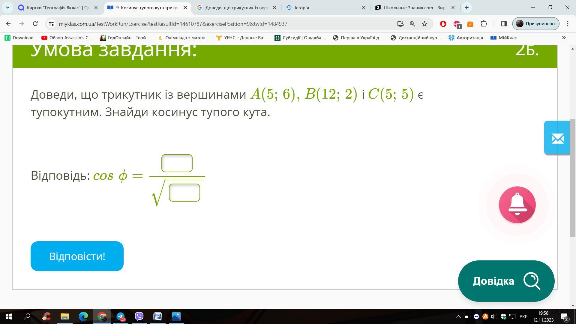 BC = C(5; 5) - B(12; 2) = (-7; 3). |AC| = √((-7)² + 3²) = √(49 + 9) = √58.